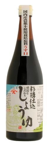 国産の頑固なこだわり栽培原料を使って作られた、杉樽仕込み醤油です。 発酵からから熟成・圧搾までに1年をかけています。 原材料:大豆(国内産)、小麦(国内産)、食塩(原塩) 【内容量】 720ml 賞味期限 1年半